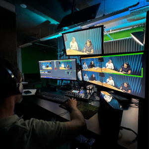 Estúdio equipado com chroma key e infraestrutura audiovisual completa
