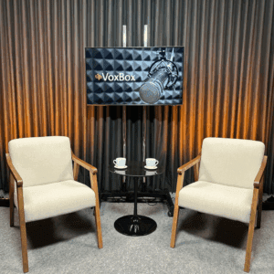 Em um estúdio VoxCom, o áudio e/ou vídeo são capturados, sincronizados e enviados a um servidor central na internet